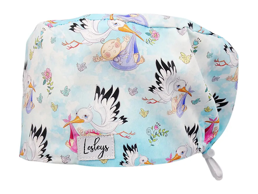 Unsere Komfort OP-Haube Klapperstorch zeichnet sich durch ein liebevolles Design aus: Niedliche Klapperstörche, die süße Babys in Decken bringen, schweben vor einem Hintergrund aus Himmel und Wolken. Dieses herzerwärmende Motiv bringt Freude und eine positive Stimmung in Ihren Arbeitsalltag und wird sicherlich auch Ihre Patienten zum Lächeln bringen.