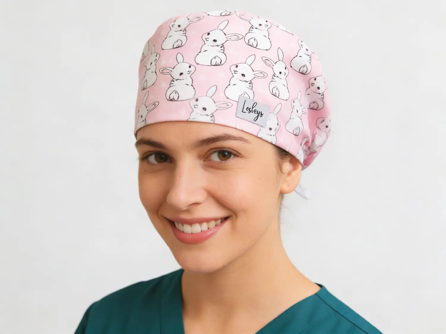 Die OP-Haube „Bunnys“ bringt eine Extraportion Niedlichkeit in Ihren Arbeitstag: Kleine weiße Häschen auf zartrosa Hintergrund, dazu feine Herzchen – freundlich, verspielt und perfekt für alle, die ein weiches, sympathisches Design lieben.