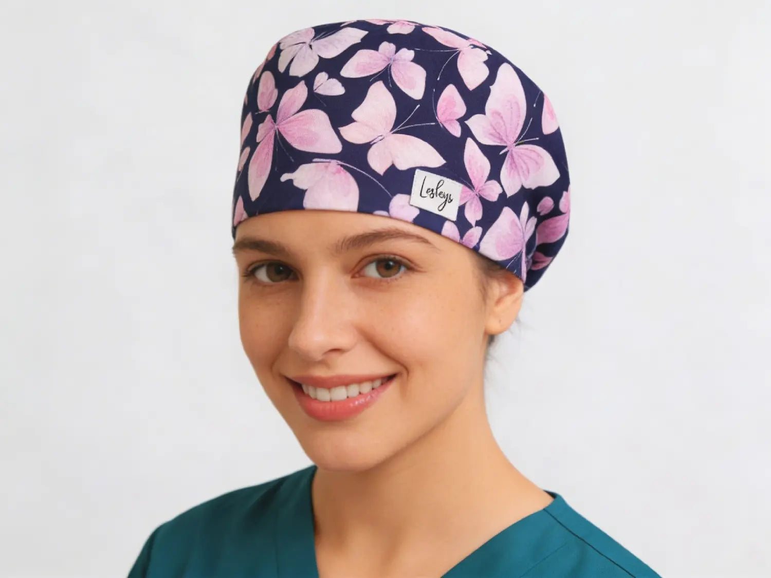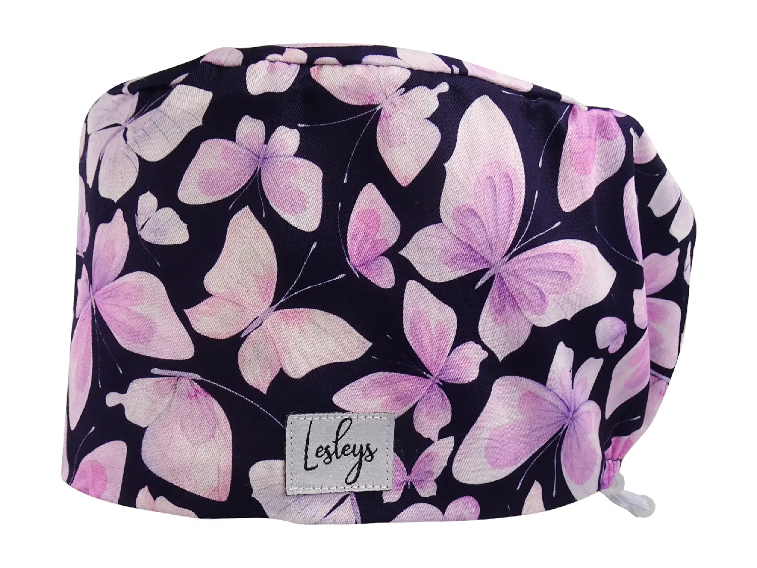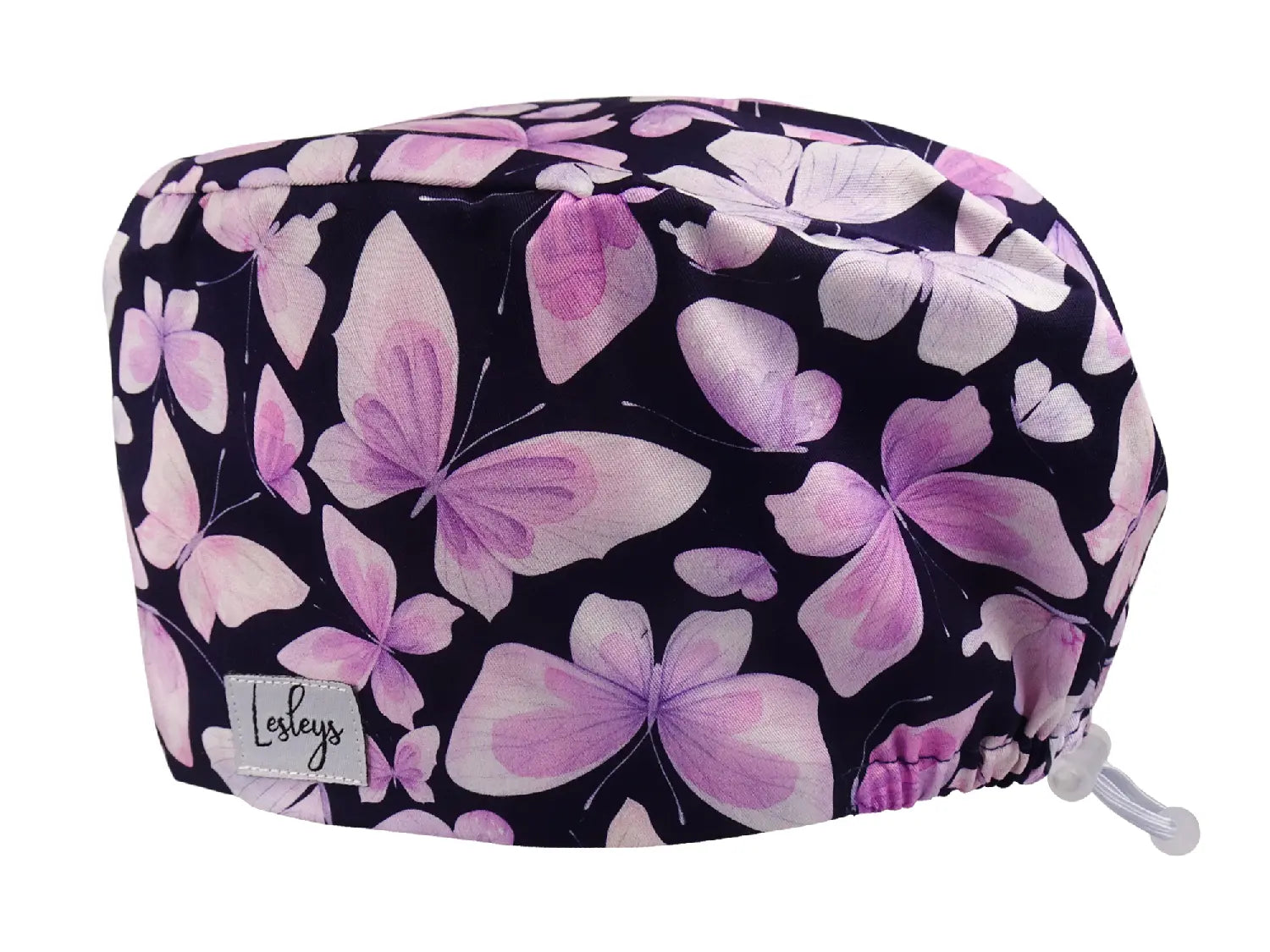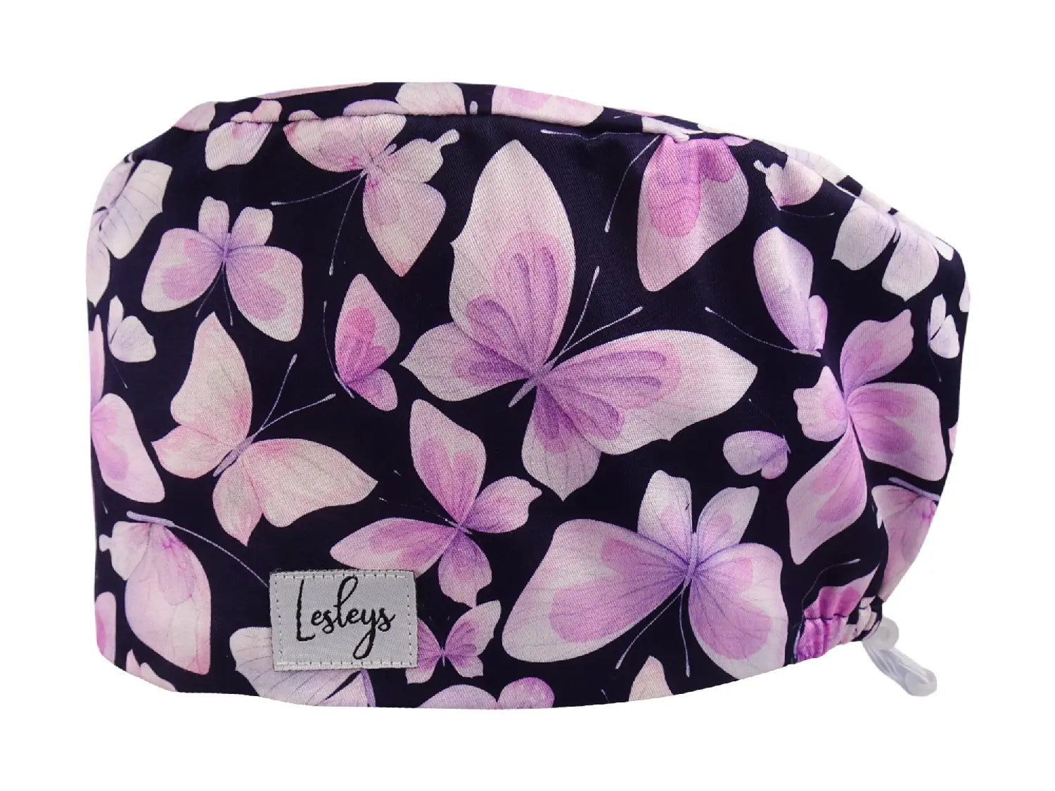 Die OP-Haube „Rosa Schmetterlinge“ wirkt leicht und elegant: Zarte Schmetterlinge in Rosé- und Lilatönen schweben auf dunklem Hintergrund und verleihen Ihrem Look eine ruhige, feminine Note – stilvoll, ohne aufdringlich zu sein.